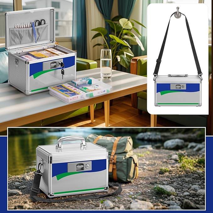 - PERFECT SIZE: Measuring 15 x 8.7 x 9.4", blue, unique lock with 2 keys + shoulder strap. our locking medicine box can store up to 22-25 pill bottles or any other small first aid