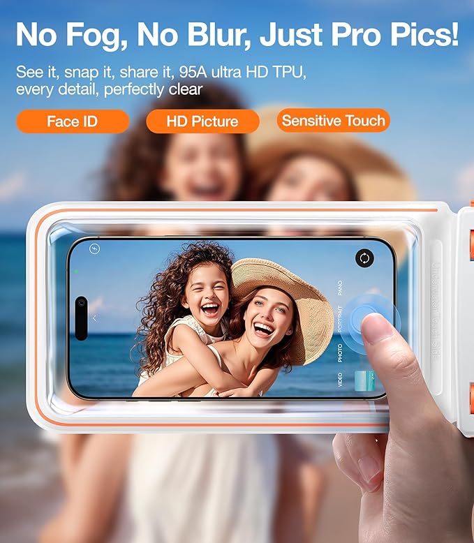- CLEAR PHOTOGRAPHY, SENSITIVE TOUCH: Crafted from high-transparency 95A TPU material with a dual-sided usable design, ensures clear capture of moments both above and below water. The "IceCube" side allows you to easily snap photos with dolphins underwater. The overwater side allows you to enjoy crystal-clear screens and a sensitive touch. Easily edit messages, Face ID and Facetime calls without removing your phone from waterproof dry bags