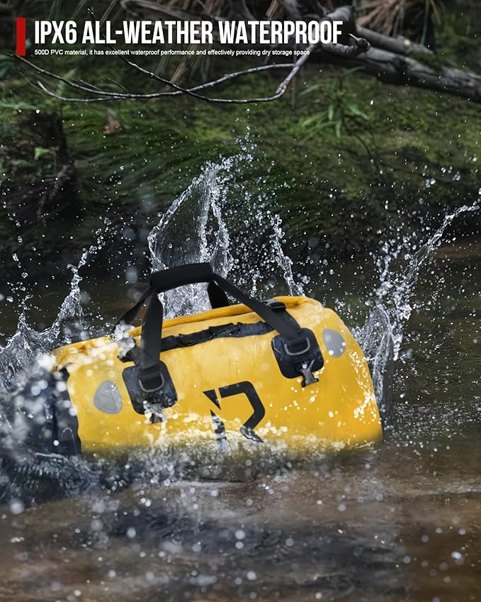 - 【Excellent waterproof property】Made with high-quality 503D PVC material, this bag features seamless sealing welding and a roll-top design that ensures complete protection against heavy rain. The Velcro closure at the top makes it easy to roll up and access your items quickly. This fabric withstands extreme temperatures, humidity, and UV exposure without cracking or deteriorating, making it perfect for long-distance travel. Your belongings will stay dry in any weather.