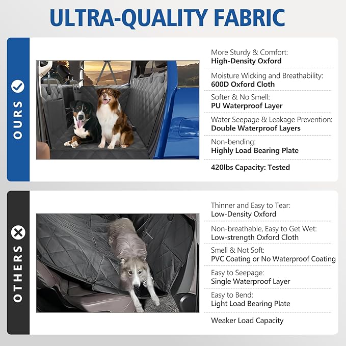 - 【Tested 420lb Load Capacity with Upgraded Hard Bottom】Our pet seat covers for trucks uses an upgraded and thickened version of the hard bottom, making the dog ride on it more stable and safe. It's been tested to carry up to 420 pounds, and three dogs are fine. The upgraded hard bottom weighs more than anything on the market and is much stronger. Suitable for full size SUVs and crew cab trucks.