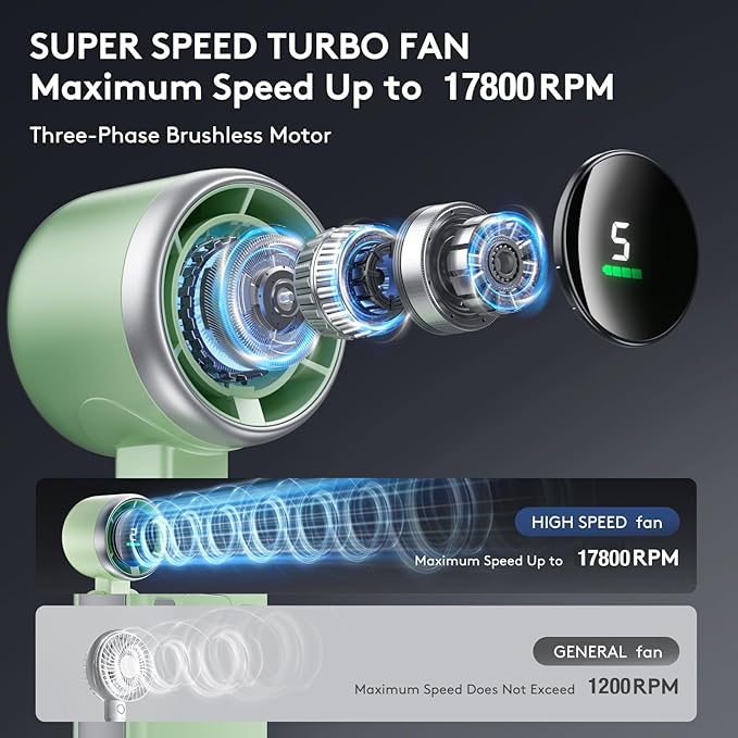 - 【3-Phase Brushless Motor, Super Strong Wind】- The personal mini fan utilizes a turbine structure with a powerful 3-phase brushless motor, multi-stage pressurized airflow system, quickly compress and cool down the hot air that is sucked in. The highest rotation speed of the handheld fan reaching up to 17000 RPM, The maximum wind speed can reach 9m/s. You can enjoy the powerful cooling wind in hot summer.