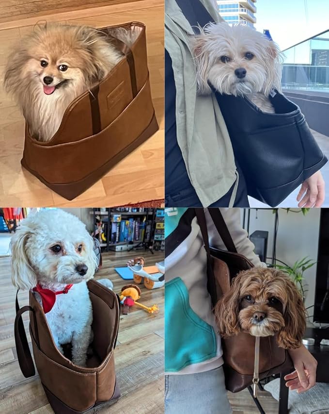 - Designer Dog Carrier Purse with Faux Leather: This fashion pet carrier is made from high-quality faux leather with a structured design that maintains its shape during use. The polished exterior provides a sophisticated look for this boujee dog purse.