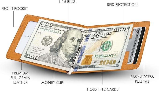 - Sleek & Accessible Design: This leather mens wallet with a money clip features a front thumb slide and a pull tab to conveniently access your most used cards. Measures 3" x 3.75" x .35" inches. Equipped with RFID blocking technology to protect your credit cards and personal information from electronic pickpocketing.
