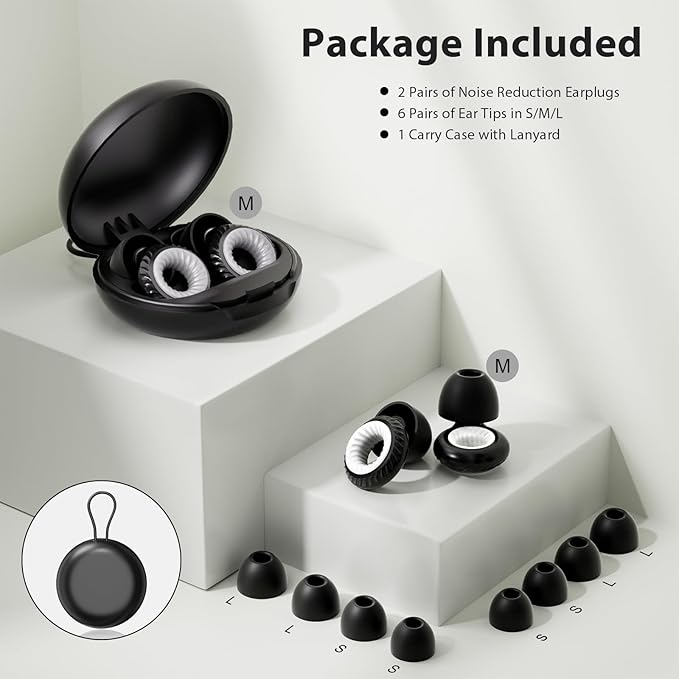 - All in One - To meet your usage needs, Yawsoy provides you with a complete earplugs set: 1 earplugs storage case with lanyard, 2 pairs of high fidelity noise reduction ear plugs, 6 pairs of replaceable S/M/L ear tips. You can always find the perfect fit!