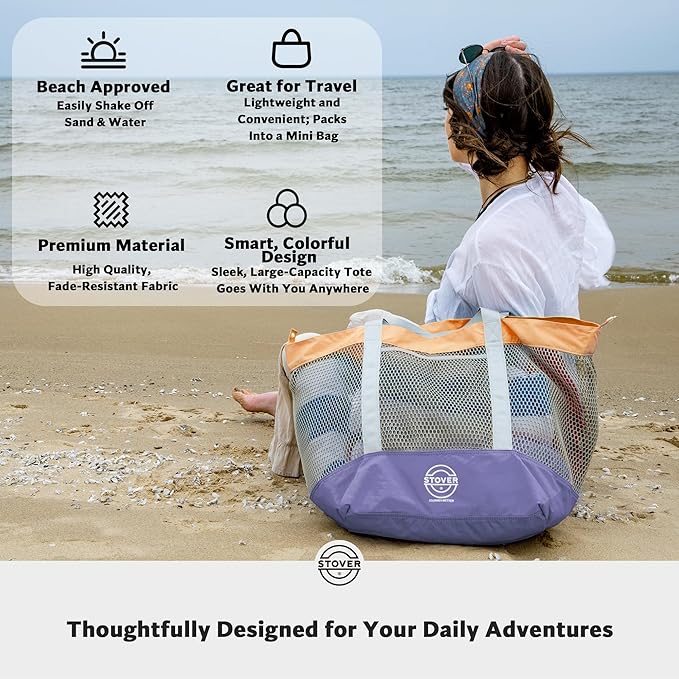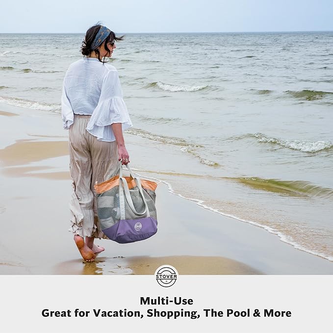 STOVER Large Mesh Beach Bag, Vacation, Pool, Shopping, & Travel Tote - Foldable w/Storage Pockets for Women, Men & Families