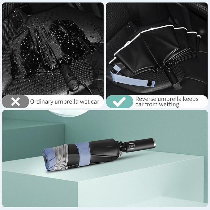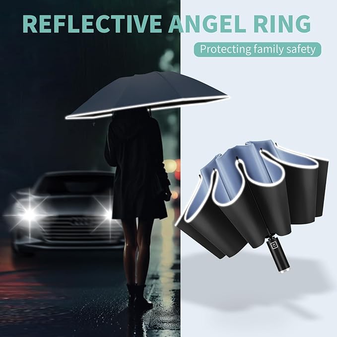 - Elevated Inverted Umbrella: Redefine your rainy day experience with Yoobure folding umbrella! Its unique inverted design allows the wet canopy to fold inside, with no splashes or drips, keeping you and the floor dry and mess-free! Plus, for added security, the travel umbrella compact features a reflective edge to enhance visibility, alerting the passing vehicles on gloomy days.