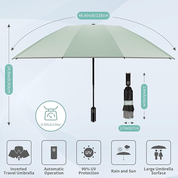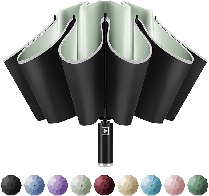 - Elevated Inverted Umbrella: Redefine your rainy day experience with Yoobure folding umbrella! Its unique inverted design allows the wet canopy to fold inside, with no splashes or drips, keeping you and the floor dry and mess-free! Plus, for added security, the travel umbrella compact features a reflective edge to enhance visibility, alerting the passing vehicles on gloomy days.