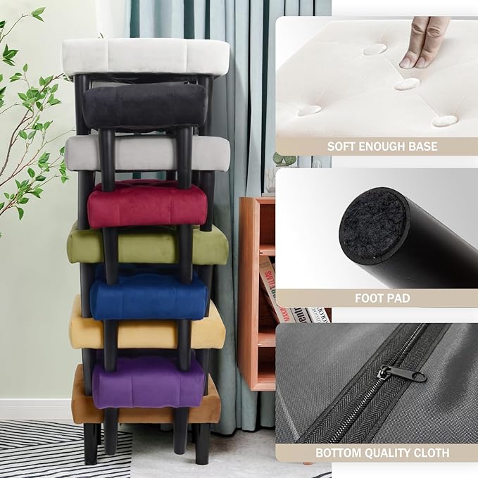 - 【AESTHETIC & COMFORTABLE】:The cover of the ottoman footrest stool is made of velvet, which is skin-friendly and comfortable. This small wood ottoman is perfect for any style of home decor