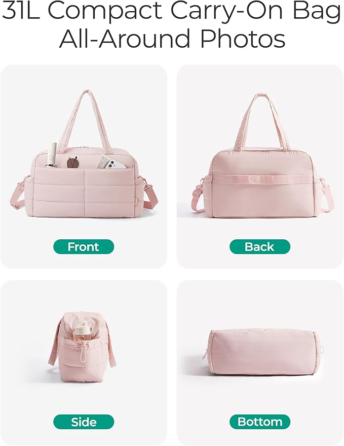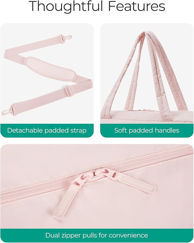 BAGSMART Gym Bag for Women, Lightweight Puffer Duffle Bag 2-PC Travel Bag, 31L Weekender Overnight Bag Quilted Carry On Tote Bag, Diaper Hospital Dance bag for Travel, Gym, Water Resistant, Pink