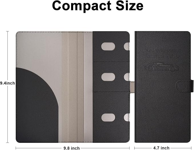 - COMPACT SIZE: The insurance and registration holder is a moderate size. The closure size, 5.5in x 9.6in x 0.35in, the expansion size: 11inch x 9.6inch. whether men or women will not feel too big or too bulky when holding it. And it can be fit for any glovebox or console well.