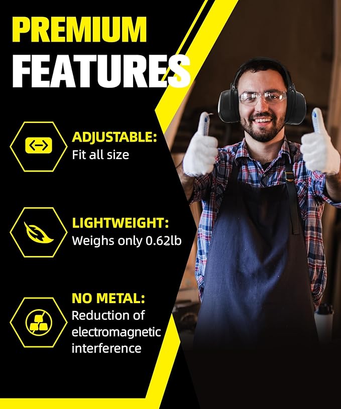 - LIGHTWEIGHT & COMFORTABLE: The ear protection earmuff is designed to be lightweight and slim. The ear cups are wide and the ear pads are extremely soft yet durable, they can fit snugly around your ears with no pressure