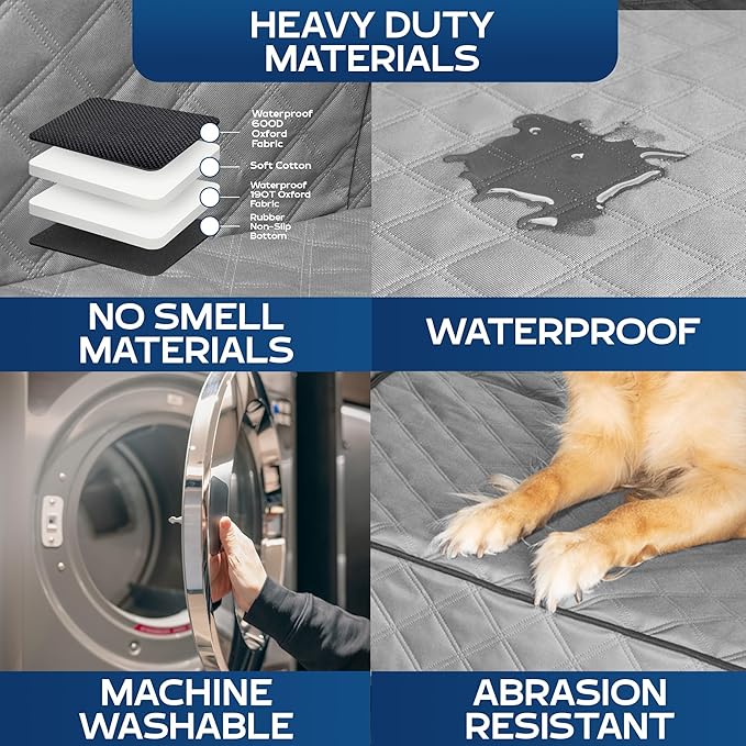 - EASY CLEAN & WATERPROOF – Triple‑layer back seat cover for dogs repels water, mud, and fur across the backseat interiors. Wipe clean on the go, or machine‑wash on gentle for heavy messes and hang‑dry to keep your back seat fresh and spotless. Comes with a heavy-duty waterproof travel bag for tidy, grab-and-go storage.
