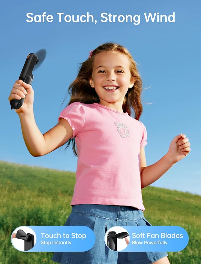 - Foldable Design and Mini Size: The folding design makes it easy to be carried and stored. Besides, with the capsule shape(5.1*1.65*1.65 inch, weight: 6.38 OZ), this rechargeable fan can hide the fan blade, small and easy to slide into your pocket and purse.Gifts choice for Christmas & New Year