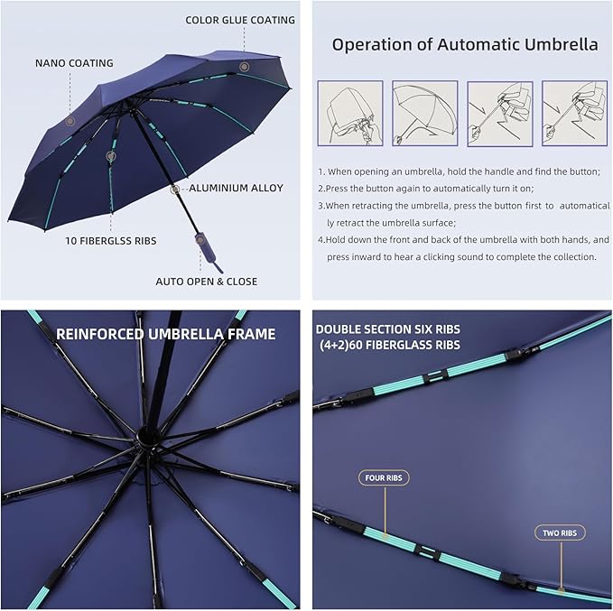 - Strong and Windproof: Engineered with a double-vented canopy and 10 sturdy fiberglasses covered frame, our windproof umbrella withstands strong winds and rain. Ideal for travelers needing a reliable, wind-resistant umbrella.