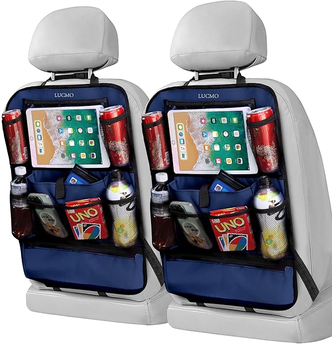 LUCMO Car Backseat Organizer with Touch Screen Tablet Holder-2 Pcs,9 Storage Pockets Car Storage Organizer Protectors Kick Mats Travel Accessories for Kids-Dark Blue