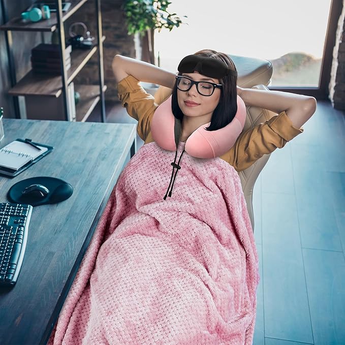 Travel Pillow and Blanket Set Neck Pillows Soft Blankets with Sleep Mask Travel Essentials for Airplane Car Memory Foam Pink
