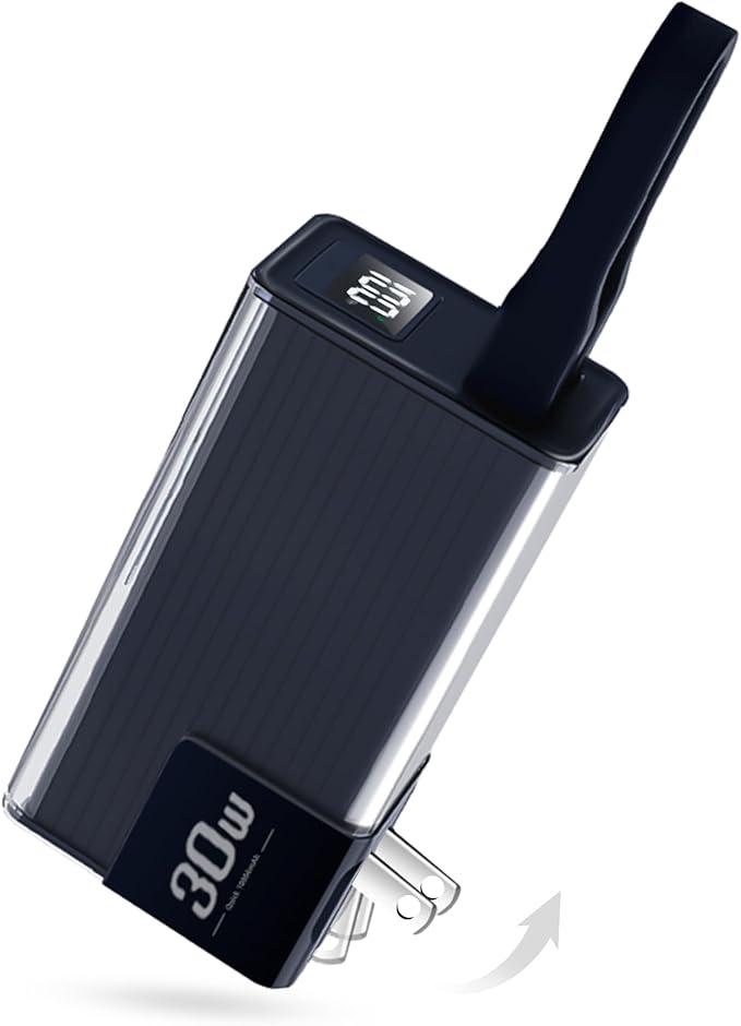 Miady Portable Charger Built-in Foldable Wall Plug, PD 30W 10000mAh Compact Power Bank has USB-C Cable & LED Display, Travel Essential Battery Pack Compatible with iPhone Galaxy Smartphones (Black)