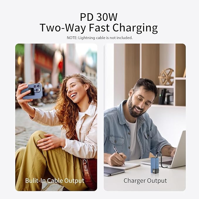 - PD 30W Two-Way Fast Charging: Portable phone charger combines the most advanced PD fast charging technologies, it can fuel your iPhone 15 Pro from 0 to 50% in just 25 minutes. It has 2 USB C ports to charge 2 devices at the same time, making it ideal for use as a bedside charger or for use at work.