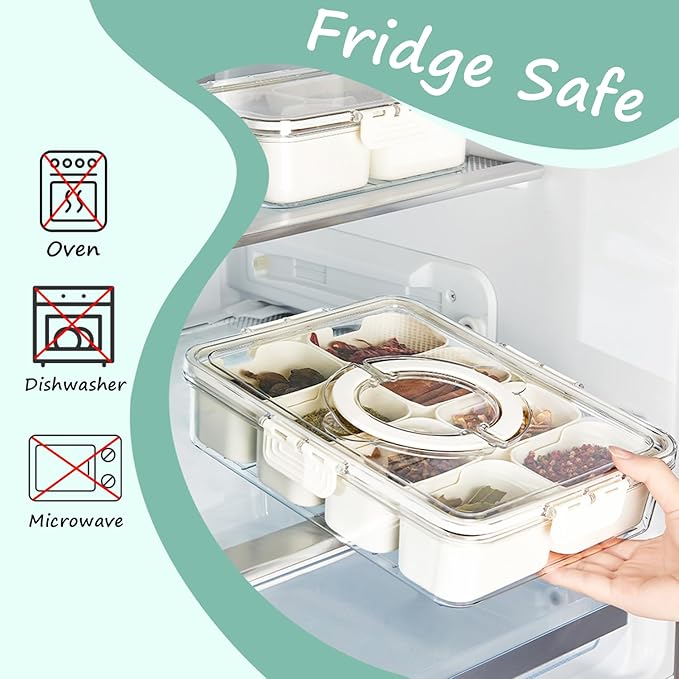 - PERFECT SIZE & MULTI COMPARTMENTS: Dimensions: 11 ×8.7 ×2.1 inches. This snackle box is portable. The compartments has perfect portion sizes and fits perfectly in spaces, The 8 divided serving tray with lid can hold of your chocolate, fruit, snacks, charcuterie, candy, nuts and vegetables. Easy to pass out to everyone gets a little of what they want.