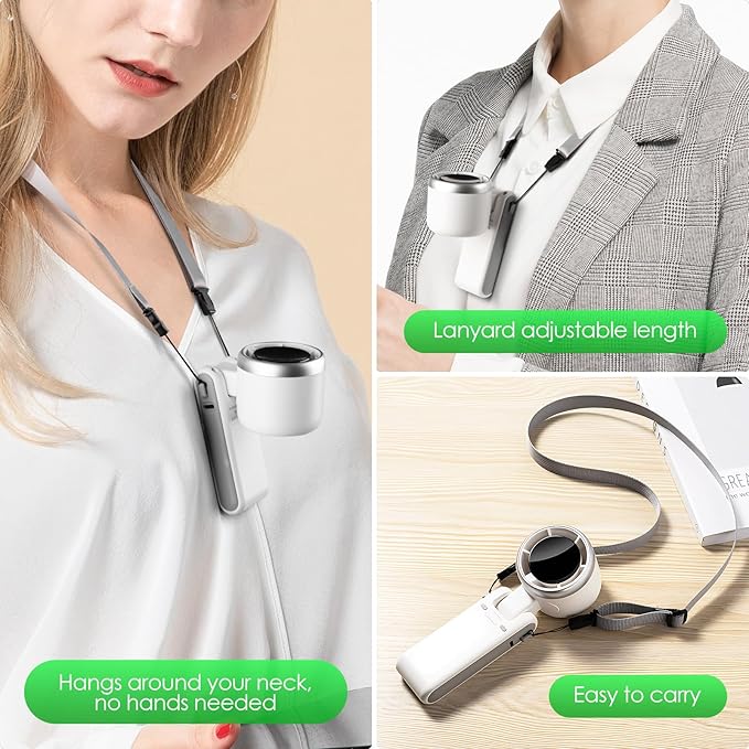 - 【180°Adjustable and Anti-loss Lanyard】Mini foldable desk fan can be foldable180° to fit any Angle. The neck fan comes with an Anti-loss lanyard that you can hang around your neck for hands-free cooling during outdoor activities or keep it on your desk to keep you focused while studying/working. Its innovative design allows handheld use, desktop placement, or wearing around the neck, providing a 3-in-1 solution to defeat heat