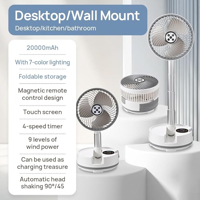 - Completely wireless: The Onnilife mini wireless oscillating fan keeps you cool anytime, anywhere! No power source? No problem! It's the most stylish foldable rechargeable fan in the world, powered by a rechargeable battery to keep you cool. The Onnilife portable foldable fan has 9 adjustable fan speeds to meet the continuous speed adjustment needs in various temperature environments. It can operate at a low noise level below 30dB, ensuring that you won't be disturbed during work, study, or sleep.