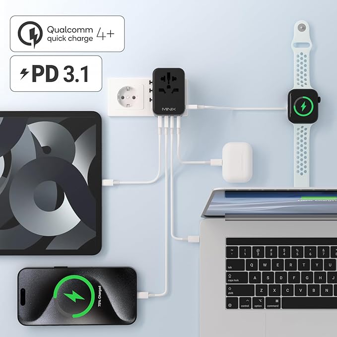- 【6 in 1 Travel Adapter Worldwide】 - Charge up to 6 devices simultaneously at high speed with 2 USB-A ports (2.4A), 3 USB-C port (3A), and 1 AC socket. Ideal for charging iPhones, laptops, tablets, power banks, cameras, headsets, and more.