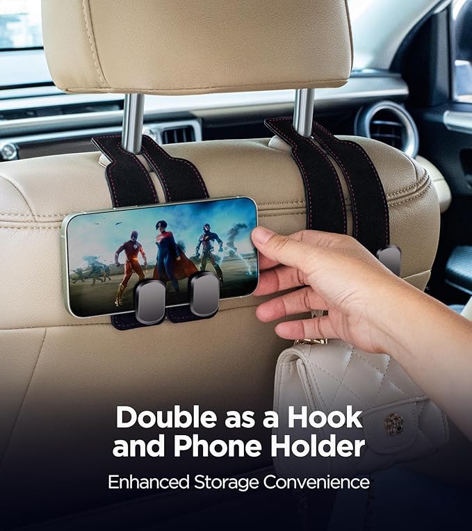 - ๐-๐ข๐ง-๐ ๐๐๐๐ญ ๐๐จ๐จ๐ค๐ฌ: Fully updated from the other traditional ones, our car seat hangers feature a dual hook system, allowing you to hang two items simultaneously. This creative design also makes it possible to place your mobile phone horizontally on these hooks, effectively turning them into a phone holder