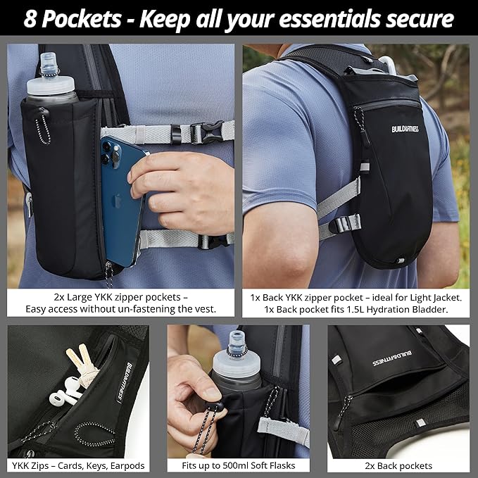 - 8 POCKET STORAGE – Equipped with 8 pockets for all your running essentials. Includes 2x front bottle pockets (NOTE: compatible with 300ml Build & Fitness water bottles or soft flasks). 2x lower front zipper pockets for phones up to 6.1” inch. 2x upper front zipper pockets for Keys, Cards, Snacks, EarPods. 1x back zipper pocket for a lightweight jacket, running cap, towel. 1x open-access pocket, ideal for 1.5L Hydration Bladder, max size: 17x28cm.