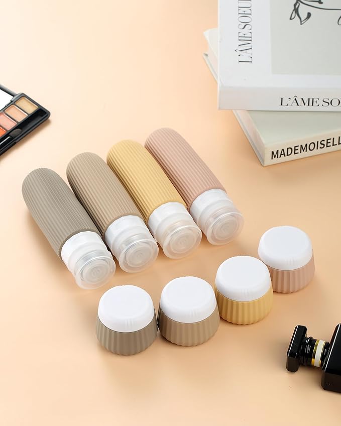 - Travel Size Toiletries: The set contains 4 pack silicone squeeze bottles and 4 pack silicone cream jars with Clear Makeup Bag.