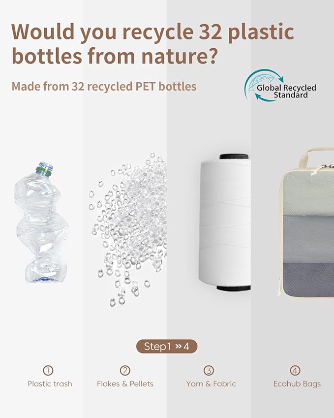 - 【SUSTAINABLE AND GUARANTEE】: ECOHUB compression packing cubes are made from at least 50% recycled materials, with fabric and lining crafted from 32 recycled PET plastic bottles. The lightweight fabric combined with YKK zippers and reinforced ripstop stitching, good gifts for women men mom, ensure durability for travel, road trip, beach vacation, cruise ship. If you have any concerns, reach out through your order (Patent Pending)