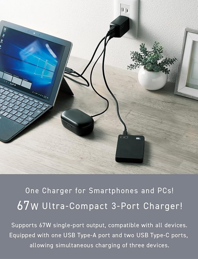 - 3-Port Multi-Device Charging: Offers a maximum output of 67W from a single USB-C port, with dual USB-C and USB-A ports providing up to 65W combined. This USB wall charger is an ideal 65W USB-C power adapter for phones, tablets, and laptops.