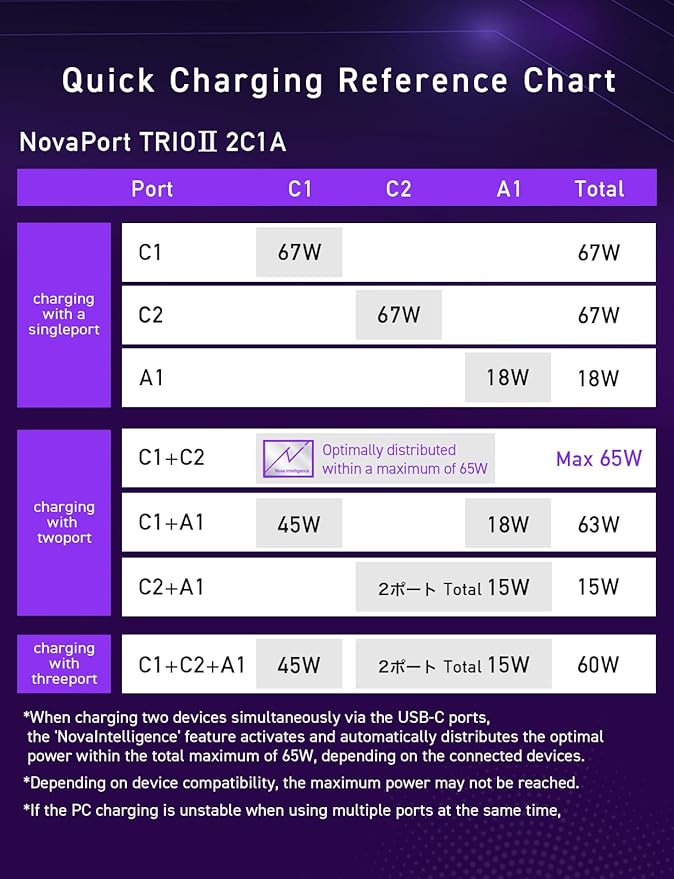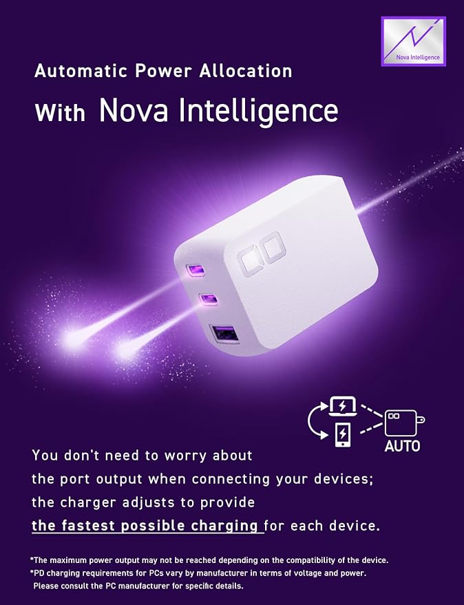 - High-Speed USB-C Charger with GaN: This 65W GaN USB-C charger block supports fast, efficient charging for laptops, tablets, and phones. Nova Intelligence adjusts power per device for ideal charging, making it the best choice for travel and daily use.