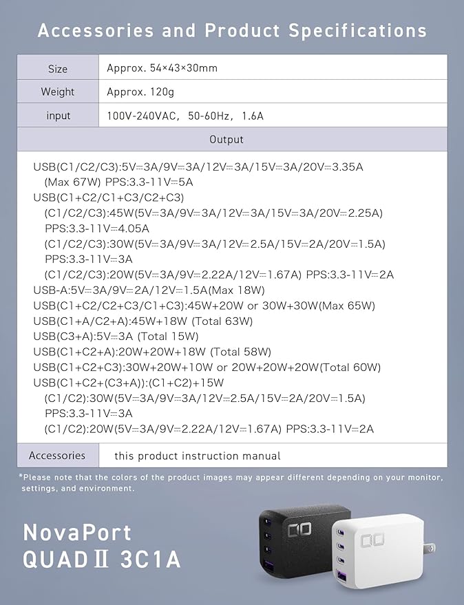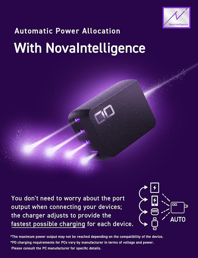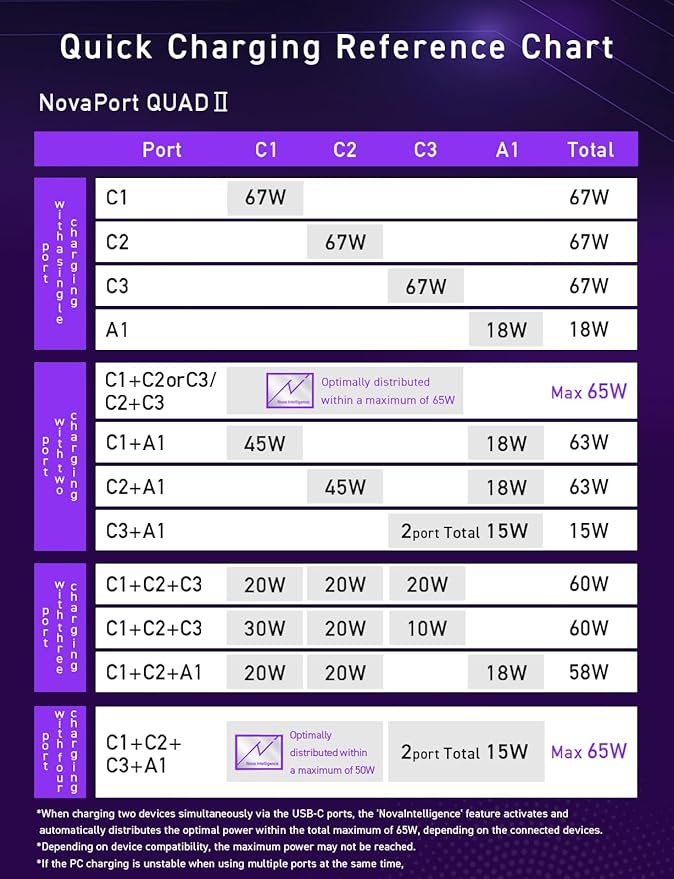 - Smart Power Management: Features Nova Intelligence for automatic power adjustment, ensuring efficient charging across devices. The 65W PD charger supports fast and reliable charging for multiple devices, including tablets and laptops.