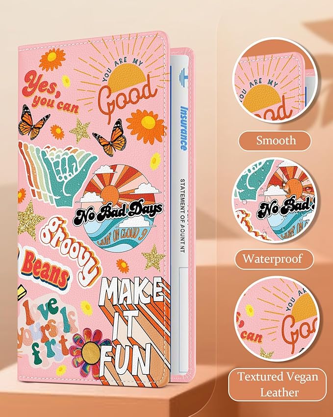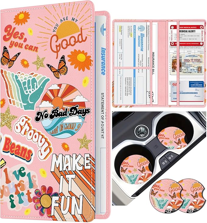 Slohif Car Registration and Insurance Card Holder with Magnetic Shut - Vehicle Glove Box Organizer Women Leather Automobile License Holders Coasters Auto Accessories Case for Document Funny Y2K