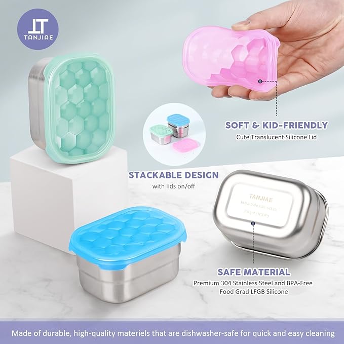 - SPACE-SAVING STACKABILITY: Stainless steel toddler snack containers can stack inside each other with the lids off, saving space in the fridge or cabinets. Sets include 4 Set 230ml (8oz) small lunch containers for kids, which are not too small yet very portable on the go, with a wide versatility for snacks, sauces, dressing, baby food, fruits, portion controls.