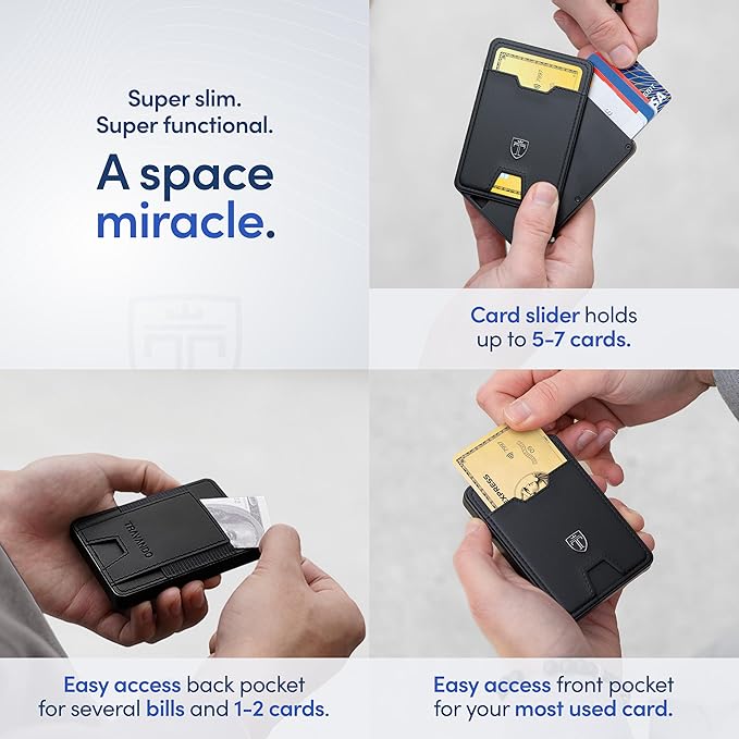 - ππππππππππ, πππ ππππππππ - This slim wallet for men holds up to 6-8 cards in the main card slot (depending on card thickness) and fits seamlessly into your jeans, suit pants, blazer or shorts pockets with its trim dimensions of only 3.8 x 2.6 x 0.5β and light weight of 3.66 oz. The cash pocket allows you to hold folded bills or 2 additional cards securely on the backside of your credit card holder