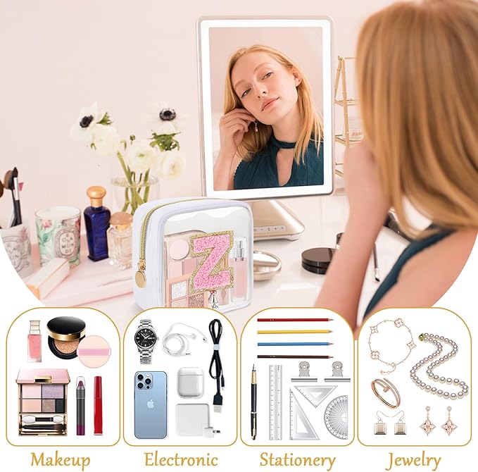 - 【Chenille Letter Patch Bag】Preppy initial makeup bag with professionally sewn chenille letter patches. You don't have to worry about them falling off. With its waterproof nylon & PVC design and unique glitter A-Z initials, it will surely stand out from all your makeup bags, brighten your mood and highlight your personality.