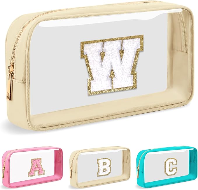 Personalized Initial Letter Clear Makeup Bag,Preppy Small Nylon&PVC Cosmetic Zipper Bag with Chenille Letter,Portable Beach Travel Skincare Toiletry Bag,Trendy Monogram Gift for Teen Girls Women,W