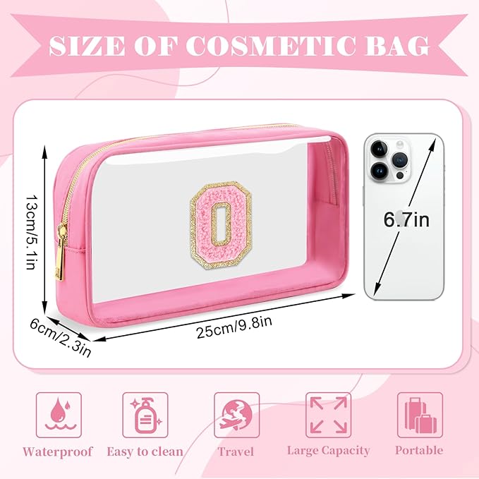 Personalized Initial Letter Clear Makeup Bag,Preppy Small Nylon&PVC Cosmetic Zipper Bag with Chenille Letter,Portable Beach Travel Skincare Toiletry Bag,Trendy Monogram Gift for Teen Girls Women,O