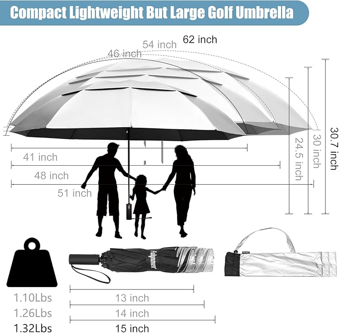 • 💨Windproof Double Canopy Designed: Golf UV umbrella windproof anti-inversion system design with a double canopy pressure release vent resists withstand wind and offers optimum ventilation and stability, 10 fiberglass ribs withstand inversion without damage, windproof UV umbrella UV blocker providing superior protection during hot sun weather.