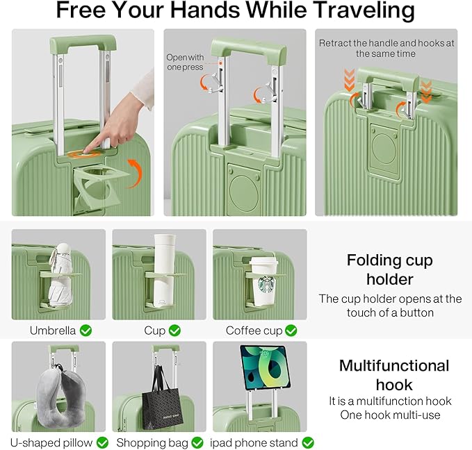 - 【Multifunctional Holder Design】Hidden folding cup holder on the back of the suitcase, phone holder located in top of luggage and the handle hook, all is to provide a comfortable and convenient travel experience.