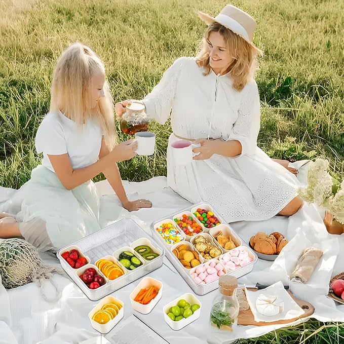 - PERFECT SIZE - Snack divider container with lid size is 11*8*2.75 inches, this size is perfect for traveling, beach, road trip, airplane, on the go. Also suitable for sandwich station, salad bar, party fruit trays.