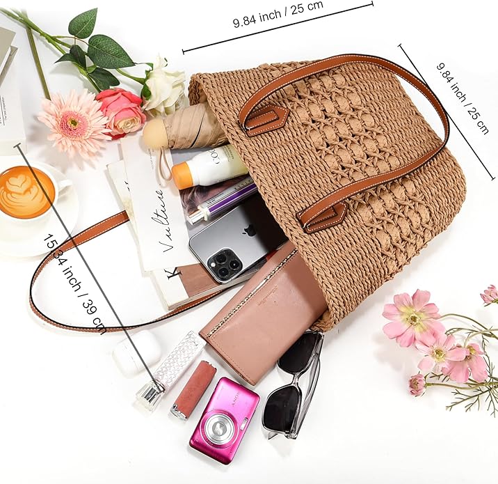 - LARGE SIZE/ LARGE CAPACITY:15.35"*9.84"*4.72" .This summer straw hobo bag is large enough for towels, water bottles, sunglasses,toys, clothing,all needs for a day at the beach or pool.It is summer beach vacation essentials.