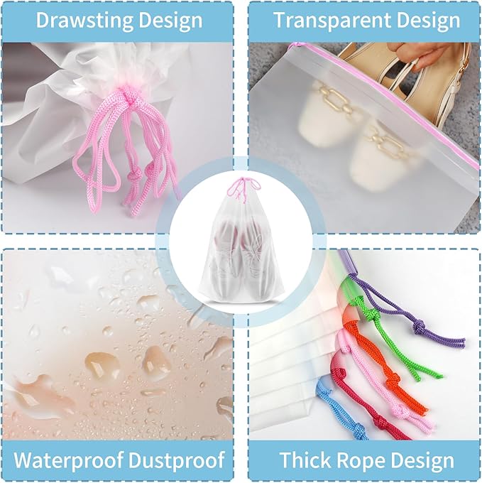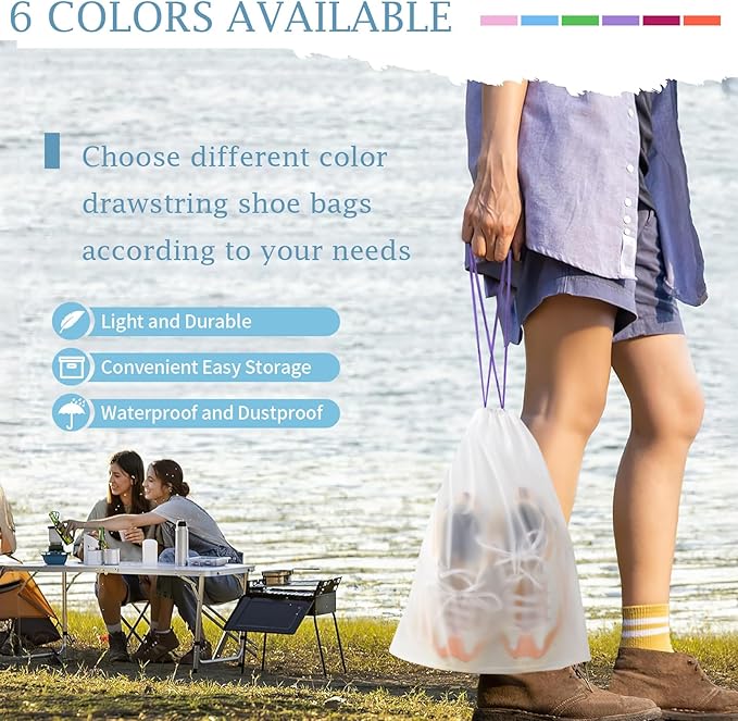 - Upgrage Craftsmanship! Premium Material: Our travel shoe bag is made of reusable waterproof PE material. The travel shoe bags are not easy to break, avoiding travel worries. Convenient colorful drawstring design for easy hanging and quick organization