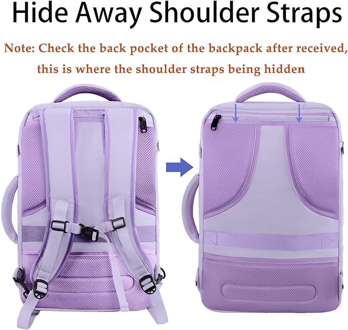 - Convertible Design: The carry on backpack is designed with hideaway padded shoulder straps which can be easily stored away in zippered back panel, transforming this vacation backpack from carry-on duffel to briefcase style and provide you a more flexible carrying experience. A luggage strap on the back is designed to fit on luggage/suitcase, for easier carry on international travel or cruise. A great gifts for people who travel