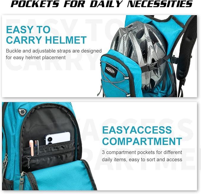 - LARGE STORAGE CAPACITY: Hydration backpack size 18" x 11.4" x 6", the main compartment is perfect for storing clothes and necessary first aid items, middle pocket for personal valuables, front pocket for snacks, tissues and more, side mesh pockets for trekking poles, water bottle, umbrella for easy access. Helmet carry between the outer pocket and middle pocket. The 18 litre hydropack backpack provides you with maximum storage space.