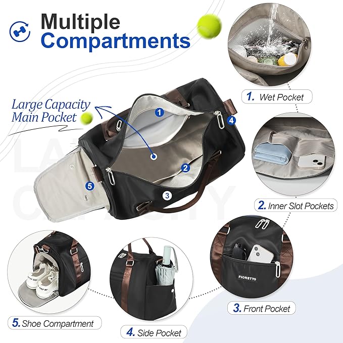 FIORETTO Womens Gym Tote Duffle Bag with Wet Pocket & Shoe Compartment, Sports Duffel Overnight Weekender Hospital Workout Carry on Bag for Girls, Ideal for Travel, Swimming, Dance, Ballet Black