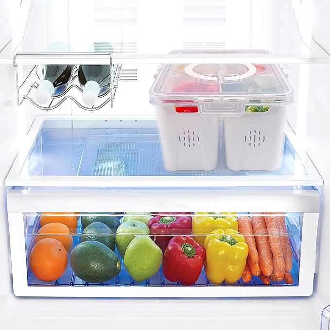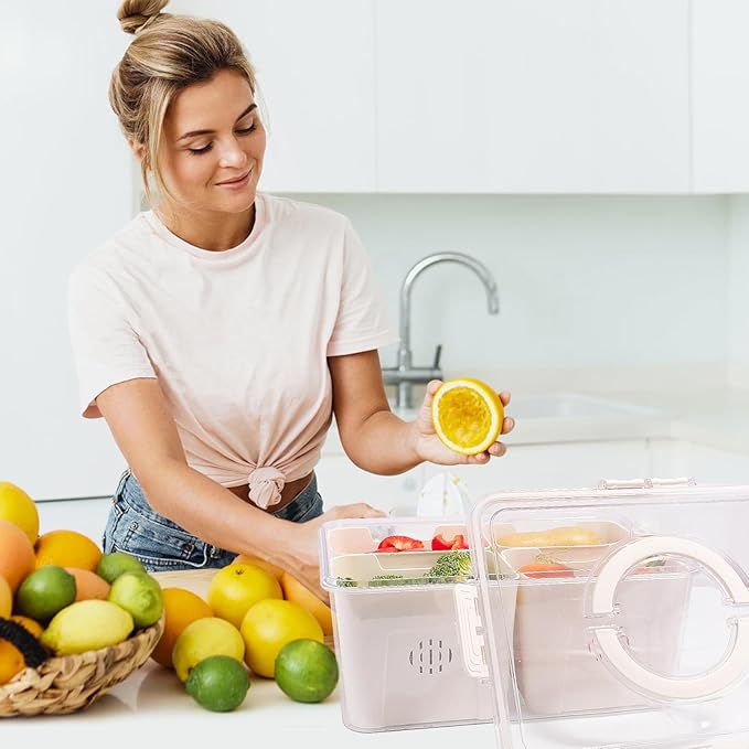 - 【Removable Dividers& Clear Lid】12.2x 9.4x 8.3 inches with 4 compartments. Divided snack containers can meet the needs of sorting food, and avoid flavor mixing. The clear lid makes it easy to identify the contents which is convenient for fridge veggie organize.