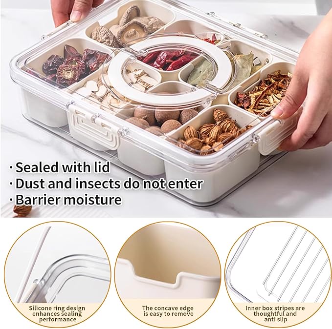 - Multifunctional:The snackle box has multiple separate compartments where you can store food one after another to avoid mixing and help keep your kitchen or cabinet clean and tidy,You can include snacks,seasonings,dried fruits,appetizers,nuts,toppings and anything else you like