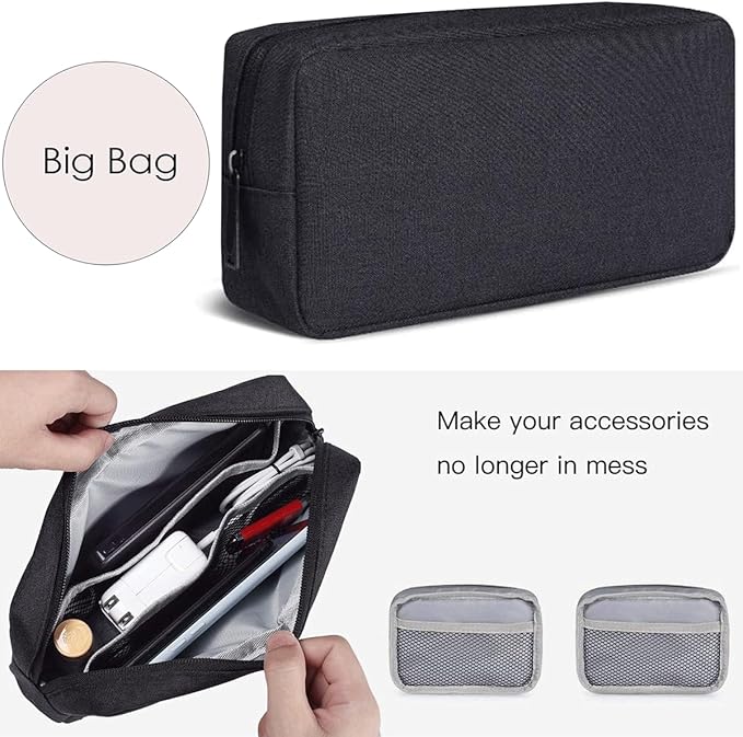 - 【Small+Big Storage Bag】2-Pack with small + big design, small dimension: 6.3" x 4.3" x 1.95", big dimension: 9" x 4.3" x 1.95", the electronics organizer bag is perfect fit for most laptop and cellphone accessories such as power bank, mouse, power adapter, hard drive, GPS, selfie stick, digital camera, USB cables, memory cards, external driver, chargers, earphones and other accessories.